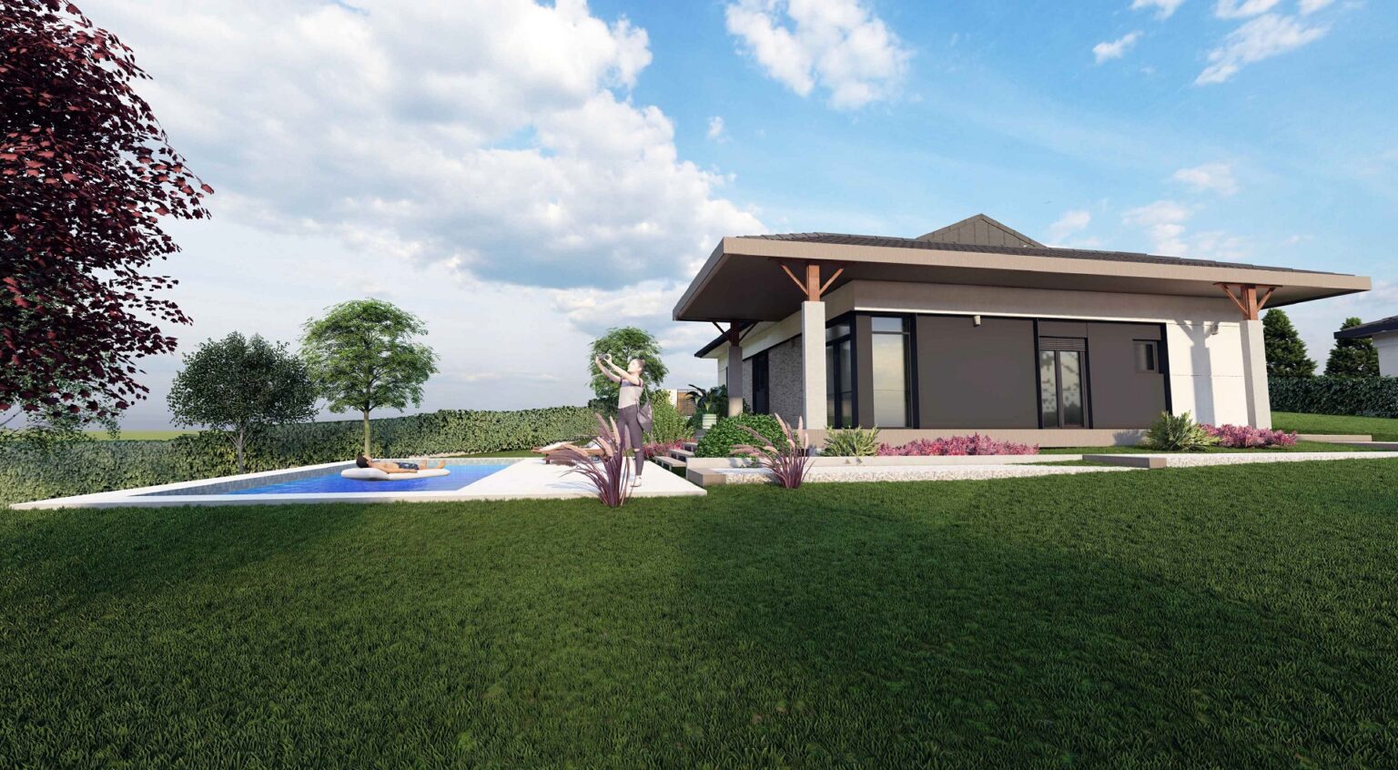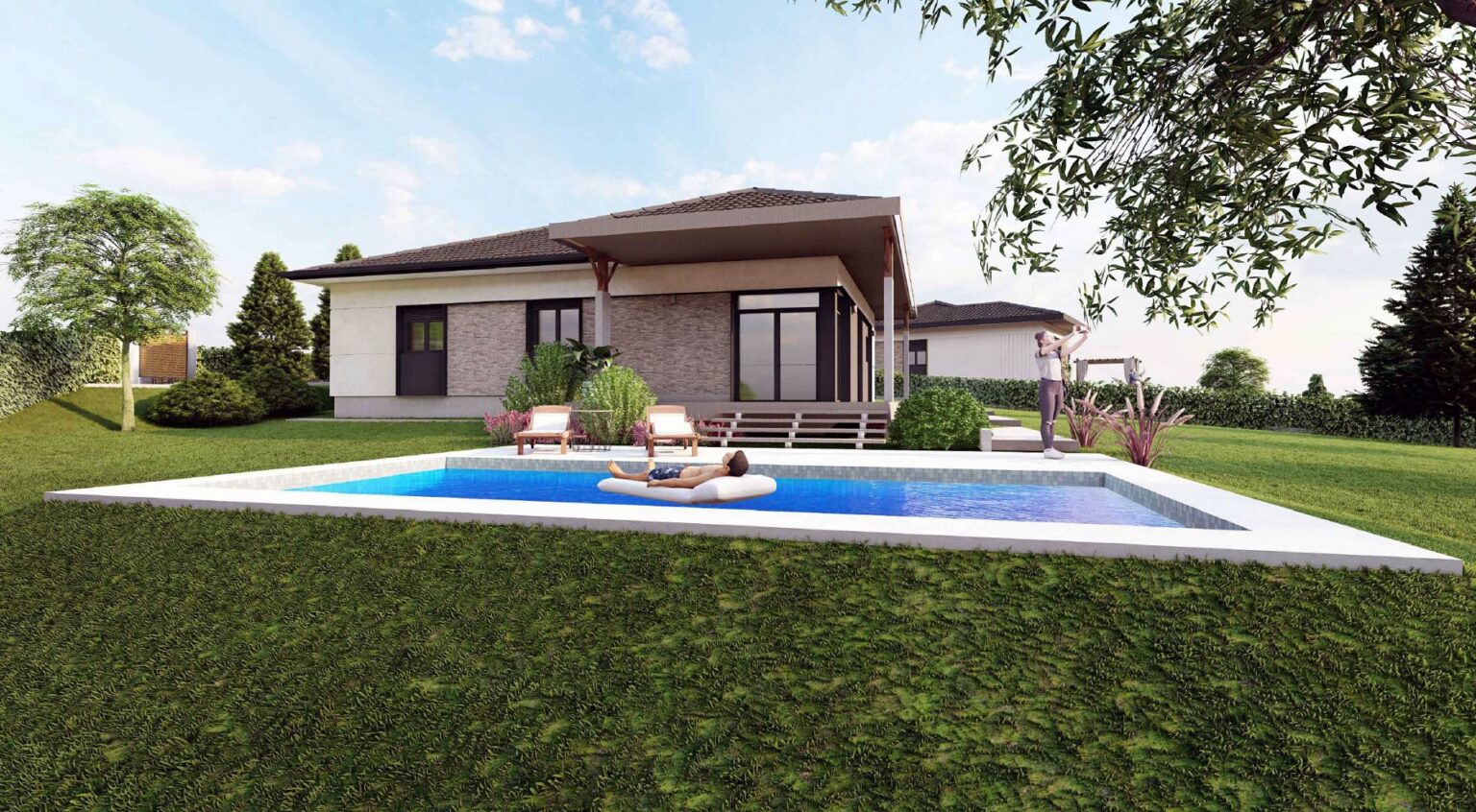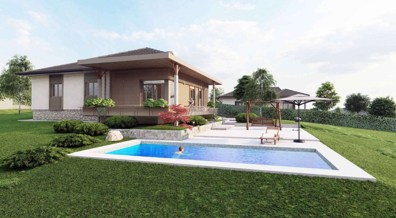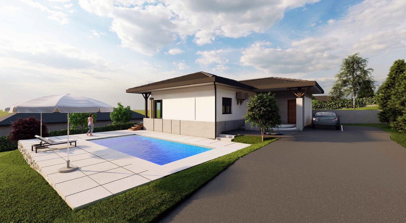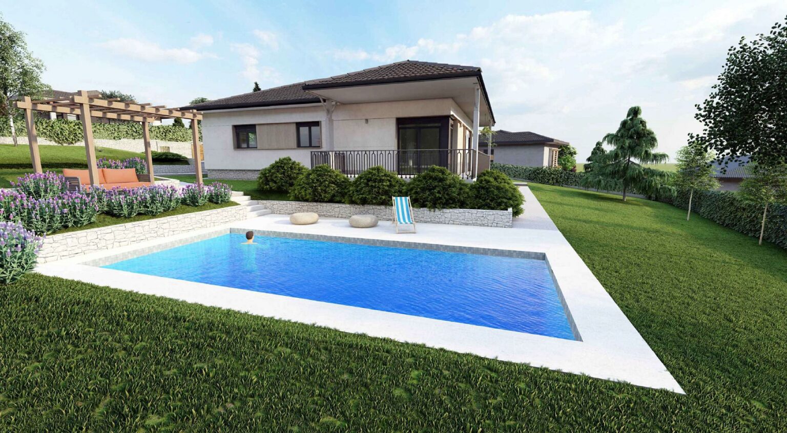 Dodatni komfor pruža bazen dimenzija 9x4 metara sa ugrađenom bazenskom opremom visoke klase, sistemom hidrolize i automatikom za jednostavno uživanje u visokom kvalitetu vode. Plaža je urađena u štampanom betonu prve klase sa protivkliznim premazima i anti-frost zaštitom.