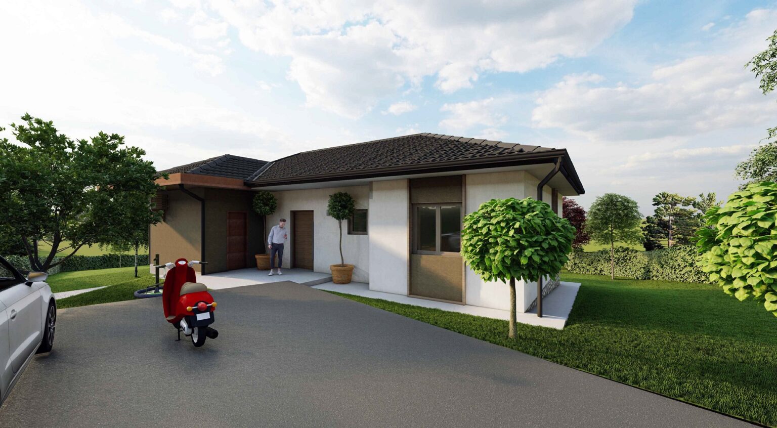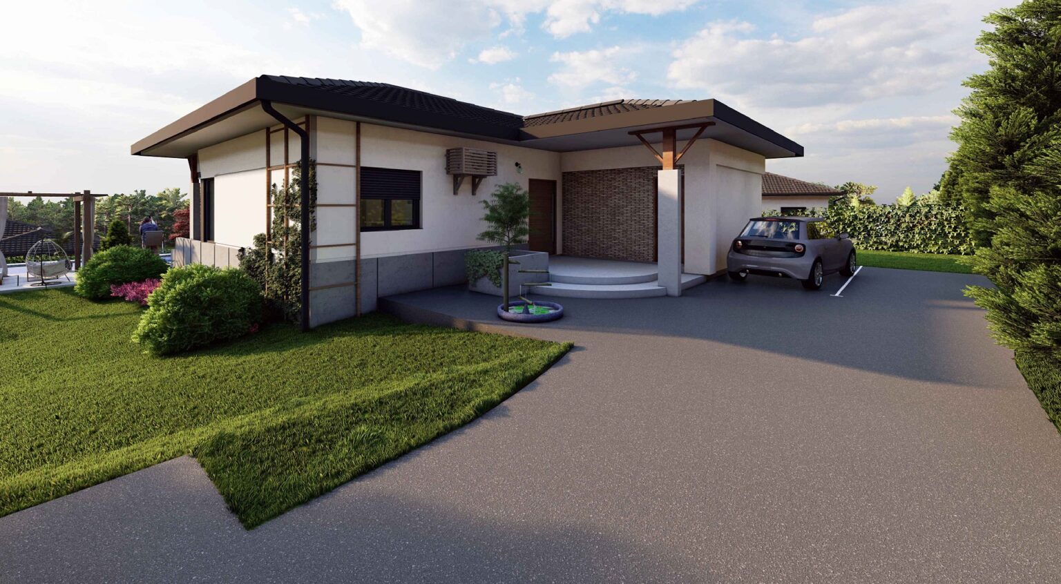 Arhitektonski izraz ostvaren je jasnom podelom prostora na zonu namenjenu zajedničkim dnevnim aktivnostima koja je uglavnom južno orijentisana kao i noćnu koja omogućava potrebnu intimnost i izolovanost. Na parcelama dominiraju travnate površine i uređeno zelenilo.